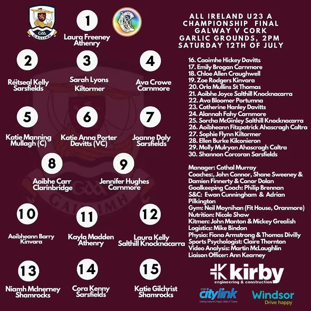 GALWAY: L Freeney; R Kelly, S Lyons, A Crowe; K Manning, KA Porter, J Daly; A Carr, J Hughes; A Barry, K Madden, L Kelly; N McInerney, C Kenny, K Gilchrist. 7Subs: A Joyce for Kenny (36), A Bloomer for Gilchrist (45), O Mullins for Madden (48), C Hanley for Barry (55), C Allen for Kelly (58).