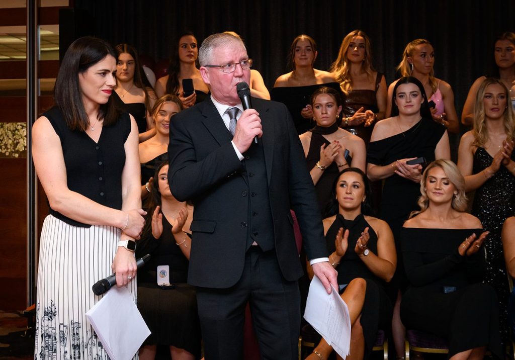 The Galway Camogie 2025 Senior, U23 and U16 teams were presented with their All Ireland medals at a Medals Presentation evening held at The Clayton Hotel on Sunday February 1st. MCs for the evening were Tommy Devane and AnnMarie Hayes, who also conducted a Q & A session with former Galway Camogie captains – Imelda Hobbins, Lorraine Ryan, Catriona Cormican and current captain Carrie Dolan. The event was also attended by Brian Molloy, President of Camogie Association.